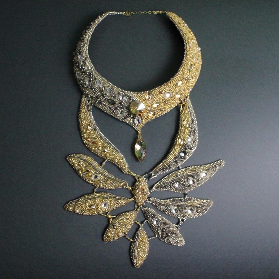 Bardzo okazały naszyjnik na wielkie wyjście. Prawdziwy orientalny luksus. Całość została stworzona techniką haftu koralikowego z użyciem ogromnej ilości kryształków i perełek Swarovski, oraz najdrobniejszych japońskich koralików w kolorach złota i srebra. Kryształki połyskują najmocniej w sztucznym świetle. Kolia mimo swoich rozmiarów nie jest ciężka i bardzo ładnie układa się na dekolcie.