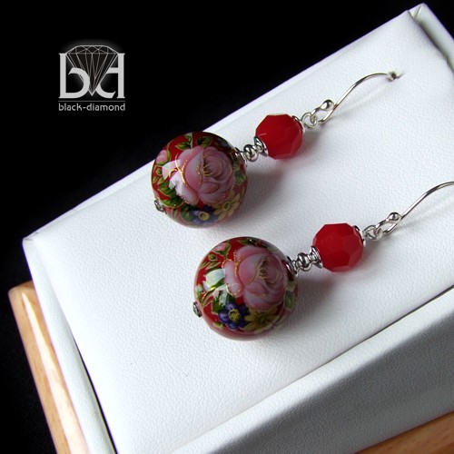Efektowne kolczyki wykonane ze srebra pr. 925, kryształów Swarovski oraz dużych, pięknie zdobionych, bardzo lekkich akrylowych kul. Kryształy są w kolorze bardzo ciemnego korala. Na zdjęciu wyszły nieco jaśniejsze. Długość całkowita: 4,5 cm. Średnica ukwieconych kul: 1,6 cm. Biżuterię otrzymasz w pudełeczku jubilerskim
