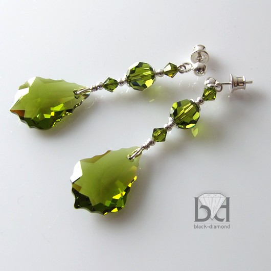 Kolczyki wykonane w moim ulubionym kolorze oliwki :-). Stworzone z kryształów Swarovski oraz srebra pr. 925. Długość całkowita: 5,5 cm. Dolne kryształy mają 2,2 cm. Zapięcie typu sztyft z dużymi kulkami i zatyczkami ze srebra z silikonem (b. wygodne). Na życzenie wymienię sztyfty na inny rodzaj bigli. Biżuterię otrzymasz w pudełeczku jubilerskim.