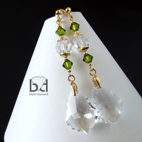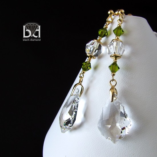 Kolczyki wykonane ze złoconego srebra oraz kryształów Swarovski. Długość całkowita: 6,3 cm. Dolne kryształki mają 2,2 cm, pozostałe 5 i 8 mm. Kolczyki otrzymasz wraz z pudełeczkiem jubilerskim.
