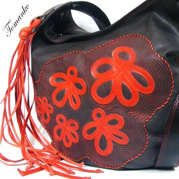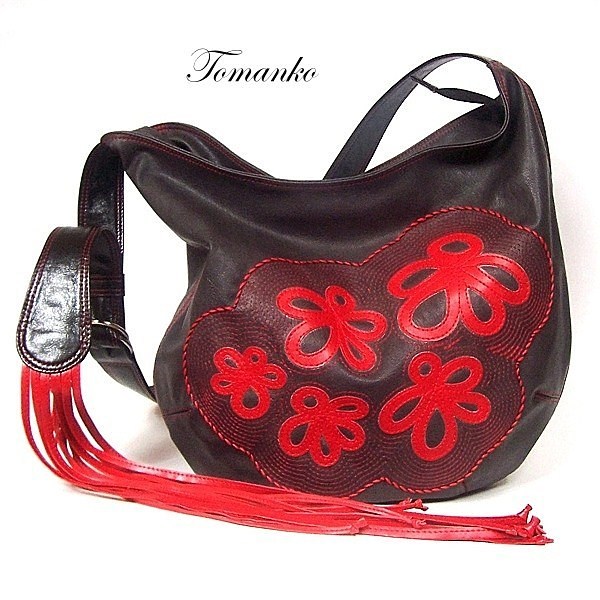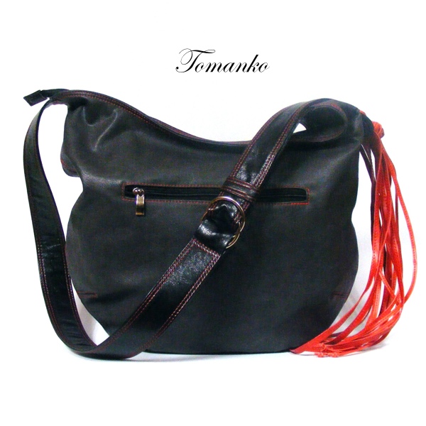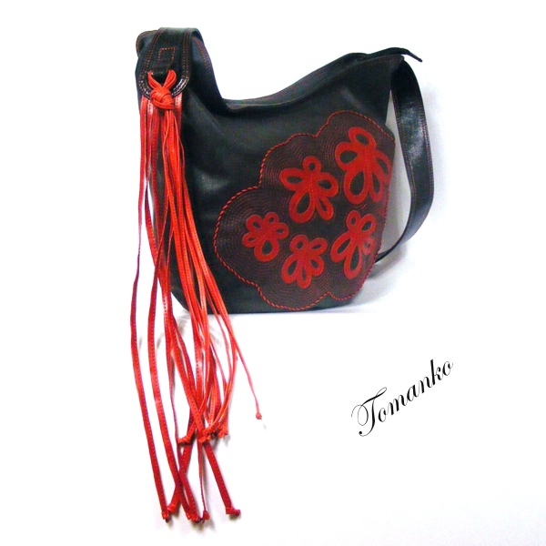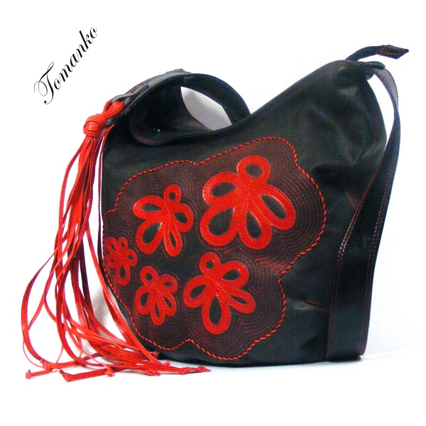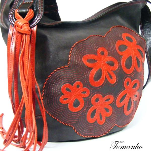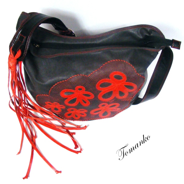 Duża torba przekładana przez ramię, wykonana z wysokiej jakości skóry ekologicznej w kolorze grafitowym (przód i tył) oraz czarnym (rączka). Torebka posiada efektowną aplikację w postaci bukietu czerwonych kwiatów oraz ręczny haft, a także fantazyjne czerwone frędzle zakończone pętelką umieszczone na końcu rączki. Całość wykonana ręcznie. Z tyłu torebki znajduje się kieszonka zapinana na zamek błyskawiczny. Torba charakteryzuje się bardzo solidnym wykonaniem z dbałością o szczegół. Wszystkie jej elementy były wycinane ręcznie. Wnętrze torebki składa się z jednej komory zapinanej na zamek błyskawiczny, kieszonki na dokumenty również zapinanej na zamek, kieszonki na komórkę oraz kieszonki na drobiazgi. Wymiary torebki: wysokość: ok. 30 cm, szerokość: ok. 38 cm, maksymalna długość rączki: ok. 100 cm (rączka regulowana), format A4: TAK