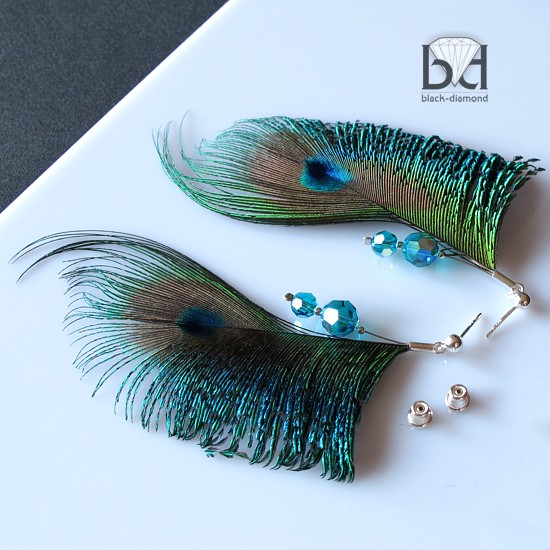 Kolczyki wykonane wg autorskiego pomysłu. Stworzyłam je z pięknie mieniących się pawich piór (nielicznie występujących) i kryształów Swarovski (6 i 8 mm). Kryształki w morskim odcieniu maja dodatkowo efekt AB - ładnie się mienią. Zapięcia ze srebra typu sztyft z bardzo wygodnymi barankami ze srebra z silikonem. Kuleczki ze srebra między kryształkami nie będą ciemniały - są pokryte rodem. Długość całkowita: ok 10 cm, szerokość piór w najszerszym miejscu: 3 cm.
