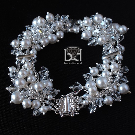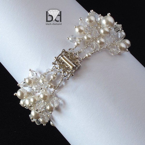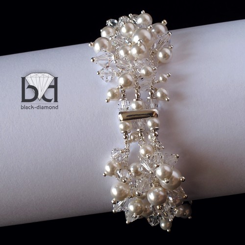 Pojedynczy egzemplarz bez możliwości powtórzenia. Bogata i efektowna bransoletka wykonana z mnóstwa perełek i kryształków Swarovski oraz srebra pr 925 oraz 999. Największe perełki mają 7 mm. Każda perełka i kryształek są solidnie i estetycznie zamocowane. Ozdobne zapięcie- wsuwane i domykane po bokach. Bransoletka będzie idealna na nadgarstek o dokładnym obwodzie 16-16,5 cm. Szerokość zapięcia to ok 1,4 cm. Szerokość bransoletki na ręce w najszerszych miejscach - ok 2,6 cm. Na życzenie mogę skrócić bransoletkę, by była odpowiednia na inny rozmiar klientki. Perełki mają odcień jasnej śmietanki/złamanej bieli. W mojej ofercie znajdują się kolczyki do kompletu, mogę pomóc wybrać właściwy wzór lub wykonać coś zupełnie nowego. Biżuterię otrzymasz wraz z pudełeczkiem jubilerskim - może stanowić gotowy pomysł na prezent.
