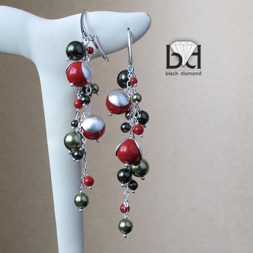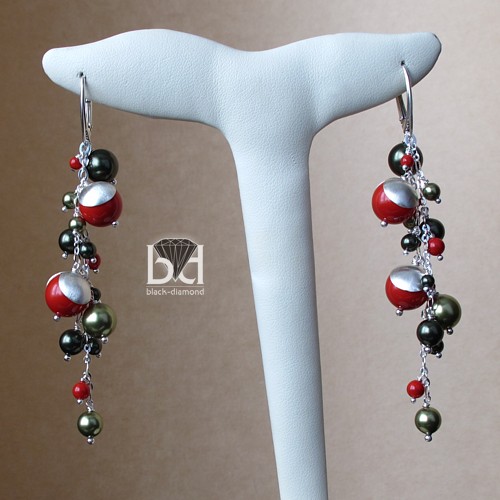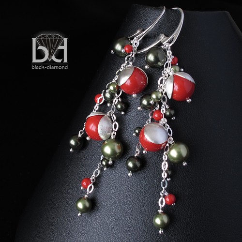 Urokliwe, długie kolczyki wykonane ze srebra oraz pereł Swarovski. Długość całkowita: 8,6 cm. Najmniejsze perełki mają 3 mm a największe 1 cm. czapeczki na czerwonych perłach są satynowane. Bigle typu angielskiego - wygodne i bezpieczne (zamykane). Kolorystyka pereł z najnowszej kolekcji 2012 firmy Swarovski. Kolczyki mimo długości nie są ciężkie. Biżuterię otrzymasz wraz z pudełeczkiem jubilerskim.