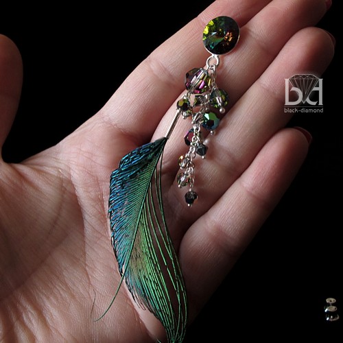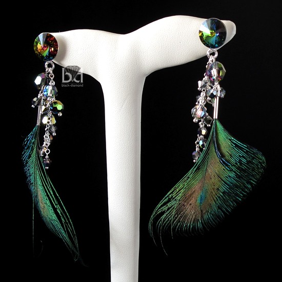 Bogate, długie i ozdobne kolczyki wykonane z pawich piór dobranych w parę, kryształów Swarovski (trójwymiarowy kolor) oraz srebra. Długość całkowita ok 9 cm. Pióra w najszerszym miejscu mają ok 2,5 cm. Zapięcie typu sztyft z wygodnymi zatyczkami ze srebra z silikonem. Kryształy w sztyftach mają aż 1,2 cm.