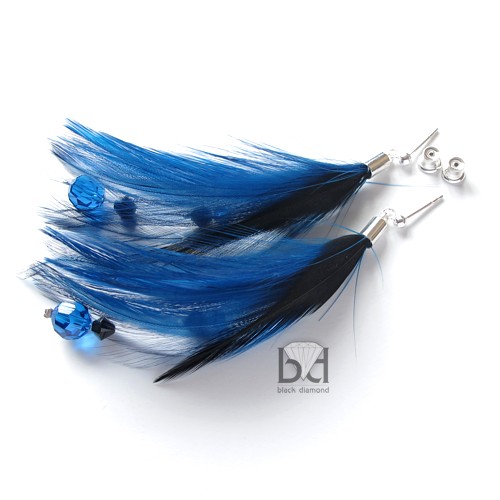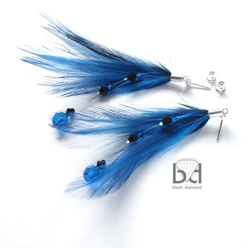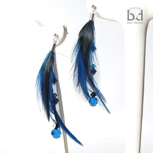 Urokliwe kolczyki z piórami i kryształami Swarovski. Kryształy mają 4, 5, i 8 mm średnicy. Pióra są w kolorze ciemno-niebieskim i czarnym. Kolczyki mają ok 9 cm całkowitej długości. Zapięcia typu sztyft ze srebra pr 925 z zatyczkami z silikonem (także srebro). Elementy trzymające pióra są srebrzone. Istnieje możliwość wymiany zapięć na inne lub klipsy