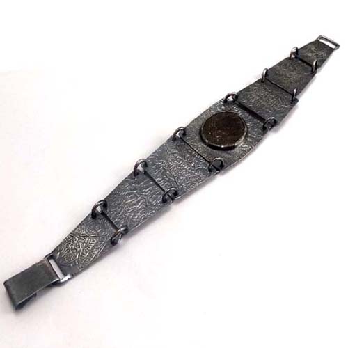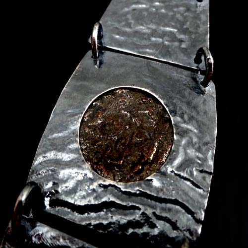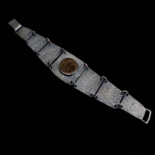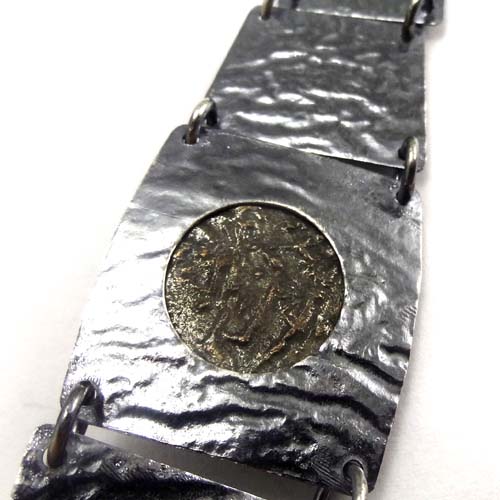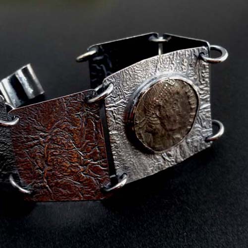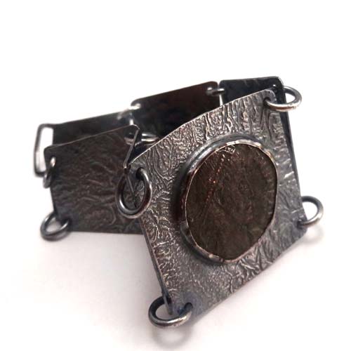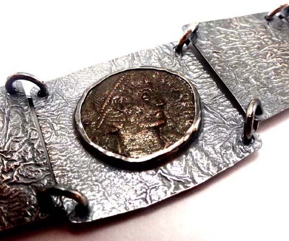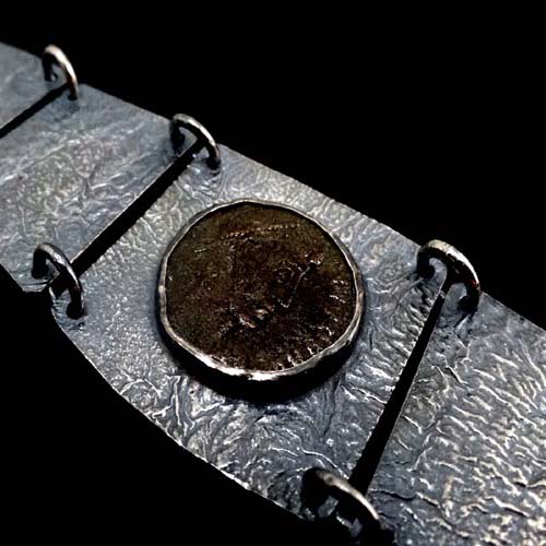 Surowa masywna bransoleta wykonana od podstaw własnoręcznie ze srebra 925.Srebro oksydowane i fakturowane.W środkowy moduł została wkomponowana autentyczna rzymska moneta,fantastycznie zachowana.Awers monety ukazuje wizerunek cesarza Konstancjusza II,panującego w latach 337 -361 n.e.Rewers monety to obraz żołnierza z tarczą i włócznią przebijającego powalonego, konnego jeźdźca, lewa ręka jeźdźca uniesiona, charakterystyczna czapka z kulką.Moneta bita w brązie w latach 355-361 w mennicy Siscia. Obwód bransolety ok.18 cm.Wymiary elementu z monetą 3 x 3,3 cm. Bransoleta zostanie ozdobnie zapakowana.Na zamówienie kolczyki,spinki mankietowe,pierścień ,sygnet,wisior,spinka do krawata do kompletu.