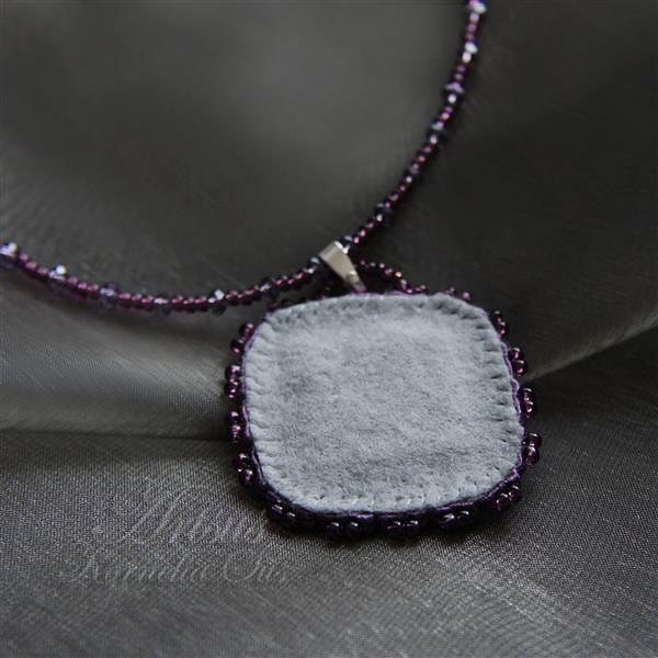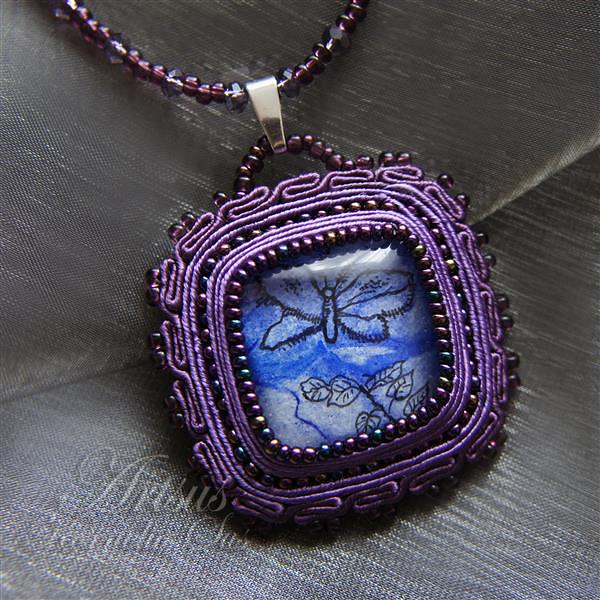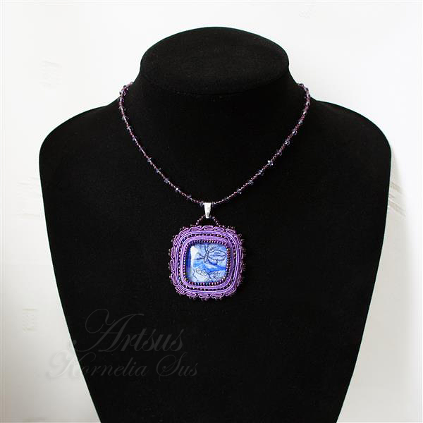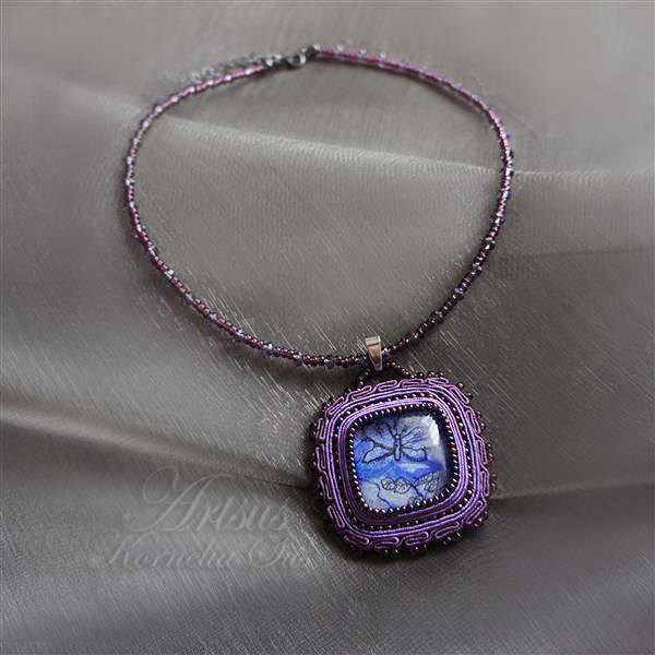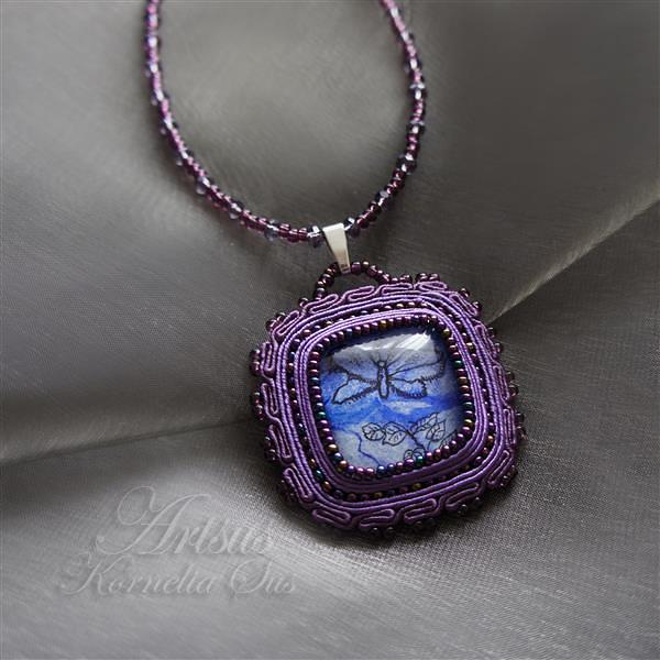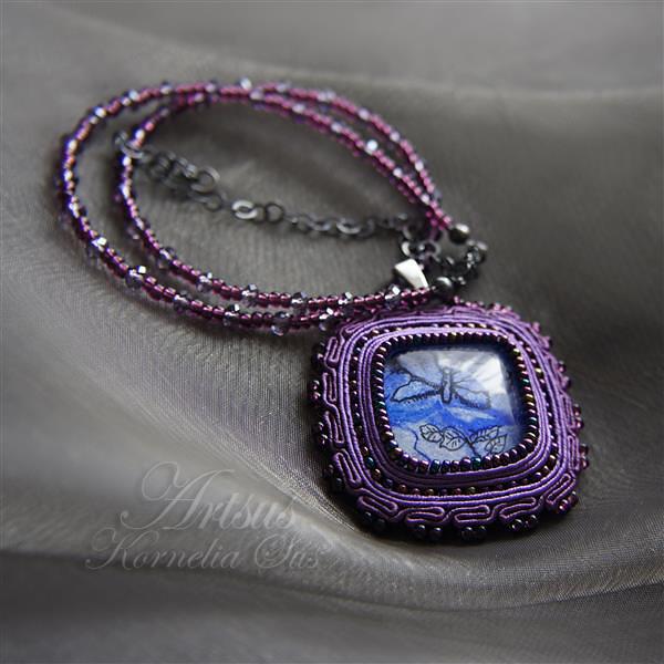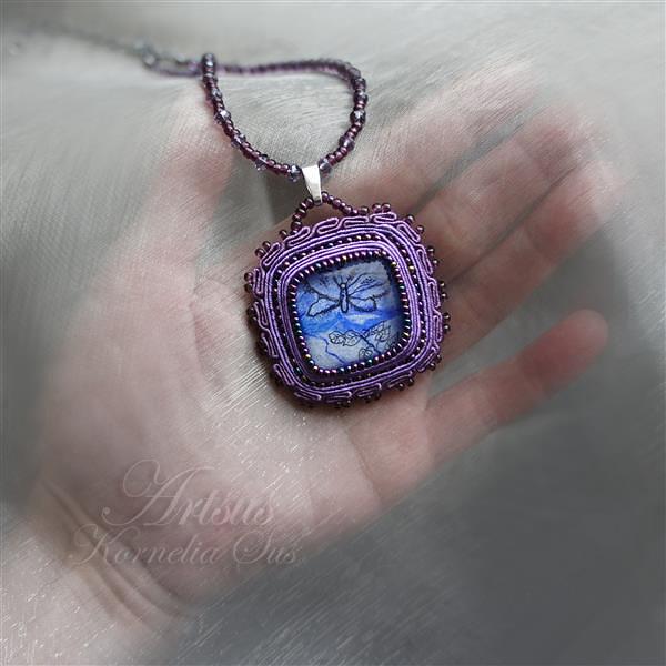 Romantyczny naszyjnik z barwnym obrazkiem zamkniętym pod szklanym kaboszonem. Namalowałam go tuszem w odcieniach fiołkowych i niebieskich. Przedstawia motyla, który tęsknie budzi się do życia. Kaboszon "ubrałam" w sutaszową oprawę. Sznurki w kolorze lawendowym zdobione są drobniutkimi koralikami opalizującymi fioletem. Tył zawieszki podszyty cienkim filcem w kolorze szarym. Krawatka, łańcuszek regulacyjny i zapięcie ze srebra 925. Naszyjnik to drobniutkie szklane koraliki i fasetowane kryształki. Wymiary zawieszki to około 45x45mm, Obwód naszyjnika ma zakres 39,5 - 51,5 cm.