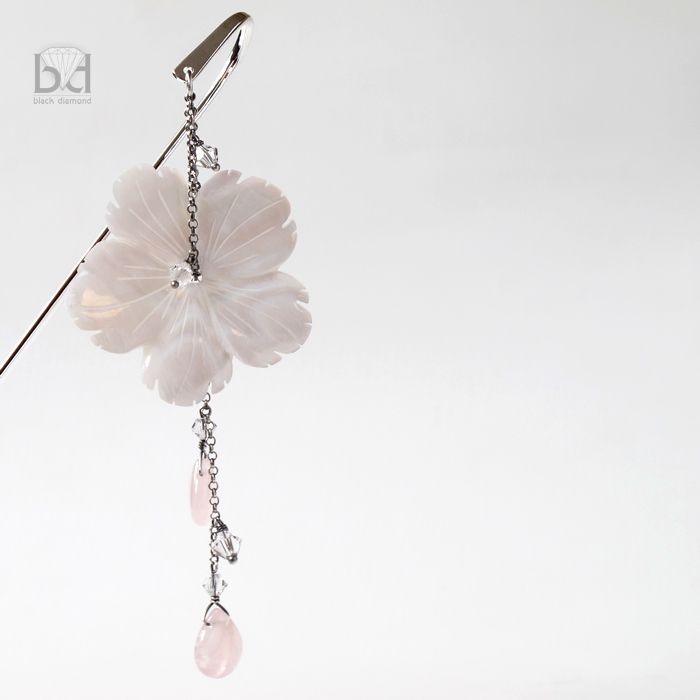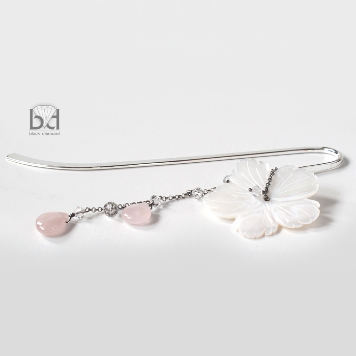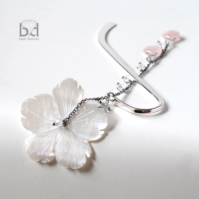 Urocza zakładka do książki. Bazą jest płaska, srebrzona podstawa o długości ok 12,5 cm długości. Element wiszący ozdobny ma 10 cm długości. Wykonałam go ze srebra, które zosydowałam, kwarcu różanego, kryształów Swarovski oraz rzeźbionego kwiatu z masy perłowej. Na życzenie (za dodatkową opłatą) dołączę estetyczne pudełeczko jubilerskie. W celu ustalenia wielkości i koloru opakowania - proszę o kontakt..