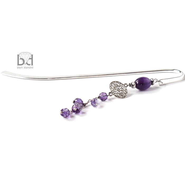 Urocza zakładka do książki. Bazą jest płaska, srebrzona podstawa o długości ok 12,5 cm długości. Element wiszący ozdobny ma 8 cm długości. Wykonałam go ze srebra, które zoksydowałam oraz kamieni ametystu. Na życzenie (za dodatkową opłatą) dołączę estetyczne pudełeczko jubilerskie. W celu ustalenia wielkości i koloru opakowania - proszę o kontakt.
