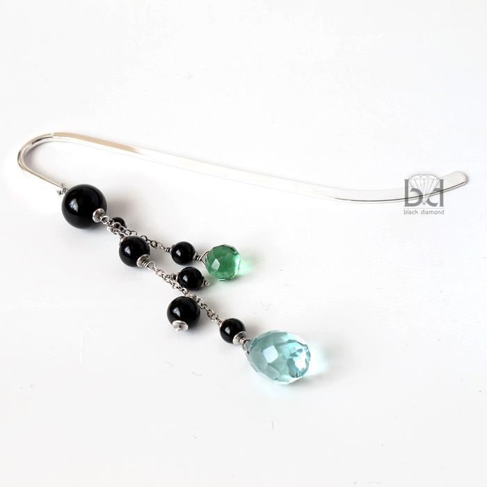 Urokliwa zakładka do książki. Bazą jest płaska, srebrzona podstawa o długości ok 12,5 cm długości. Element wiszący ozdobny ma 9,6 cm długości. Wykonałam go ze srebra, które zoksydowałam, kul onyksu (od 4 do 12 mm średnicy) oraz fasetowanych kropel kwarcu syntetycznego (długość 1 i 1,7 cm). Zakładkę wysyłam wraz z eleganckim pudełeczkiem jubilerskim.