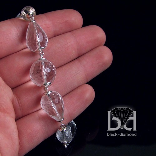 Okazała bransoletka wykonana z kryształów górskich oraz srebra pr. 925. Długość: 21cm + 2 cm przedłużki. Zatem będzie najlepiej pasowała na nadgarstek o obwodzie ok 16,5- 18 cm. Długość bransoletki wymuszają także duże średnice korali. Największy z nich - centralny, ma 1,4 cm średnicy. Kryształy są bardziej krystaliczne i przejrzyste niż na zdjęciach. W mojej galerii znajdują się kolczyki do kompletu. Biżuterię otrzymasz w pudełeczku jubilerskim - eleganckim bez zbędnych napisów.