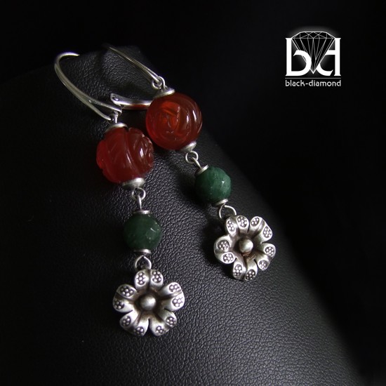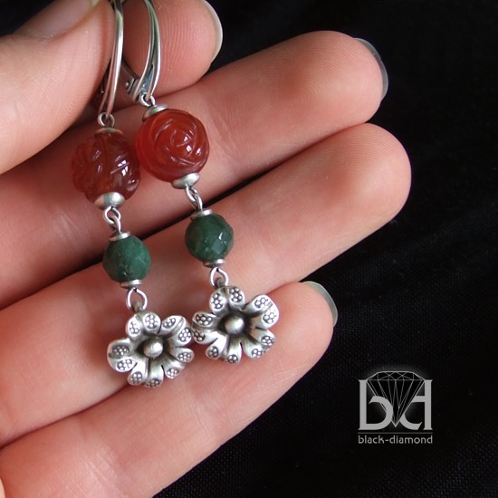 Urocze kolczyki, które stanowią komplet z bransoletką o tej samej nazwie. Zostały wykonane z szlifowanych na kształt róż kamieni karneol, pięknego, zielonego minerału oraz srebra. Srebro zostało przeze mnie zoksydowane i zmatowione, co nadało kolczykom charakteru - kolczyki przypominają wyjęte z babcinej szkatułki. Na życzenie wymienię bigle na inny typ. Biżuterię otrzymasz w pudełeczku jubilerskim bez zbędnych napisów. Dzięki temu może stanowić idealny pomysł na prezent dla wyjątkowej kobiety. Długość całkowita: 5,5 cm. Długość bez bigli: 4 cm.