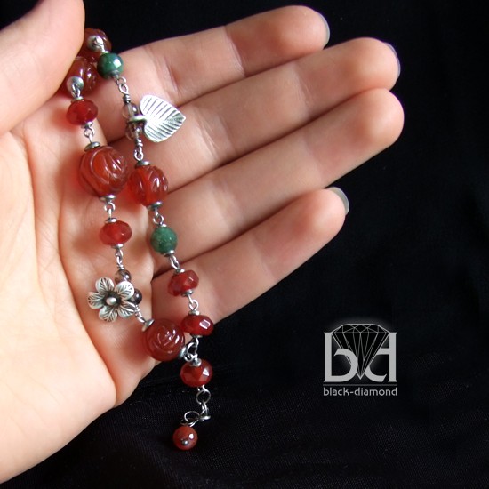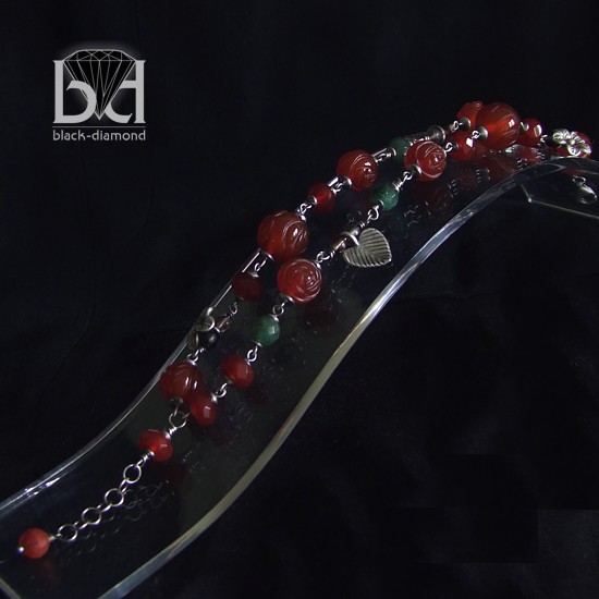 Okazała bransoleta wykonana z szlifowanych na kształt róży kamieni karneol, zielonego, pięknego minerału oraz srebra. Srebro zostało przeze mnie zoksydowane i zmatowione, co nadało bransoletce charakteru - przypomina wyjętą z babcinej szkatułki. Biżuterię otrzymasz w pudełeczku jubilerskim bez zbędnych napisów. Dzięki temu może stanowić idealny pomysł na prezent dla wyjątkowej kobiety. Długość: 19 cm + 2 cm przedłużki. Bransoletka będzie najlepiej pasowała na nadgarstek o obwodzie: 15,5-18cm.