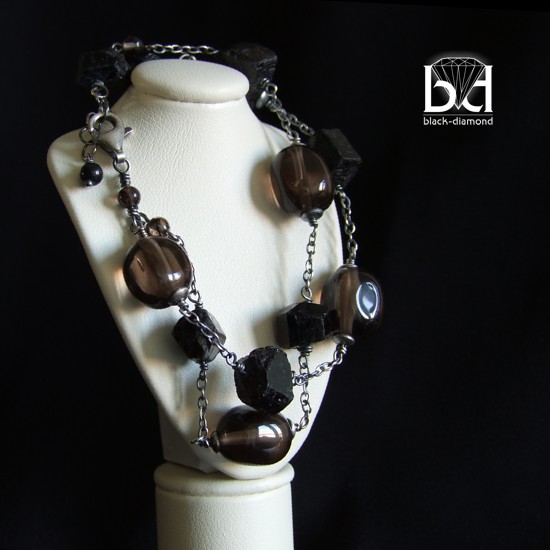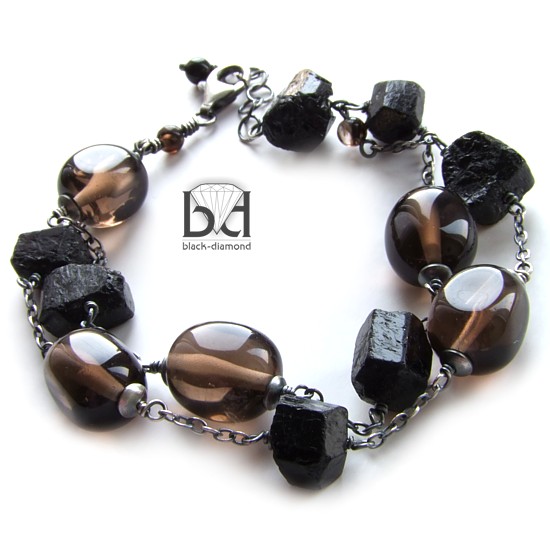 Surowa w swym wyglądzie bransoletka wykonana ze szlifowanych bryłek kwarcu dymnego oraz surowych, niczym bryły węgla, kamieni turmalinu. Srebro zostało przeze mnie zoksydowane i zmatowione, co nadało biżuterii charakteru - przypomina wyjętą z babcinej szkatułki. Biżuterię otrzymasz w pudełeczku jubilerskim bez zbędnych napisów. Dzięki temu może stanowić idealny pomysł na prezent dla wyjątkowej kobiety. Długość bransoletki: 19cm + 2 cm przedłużki. Będzie pasowała na nadgarstek o obwodzie dokładnym ok 15,5-17,5. Wielkość kwarców dymnych: ok 1 cm Wielkości turmalinów: do 1 cm