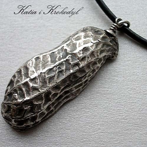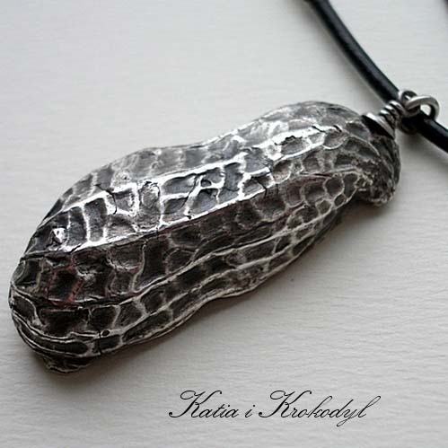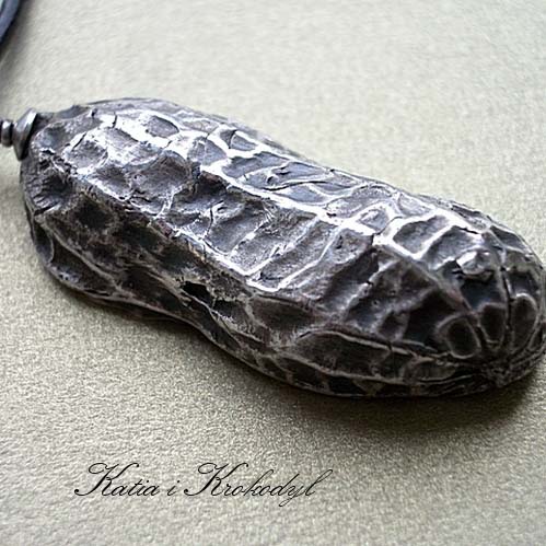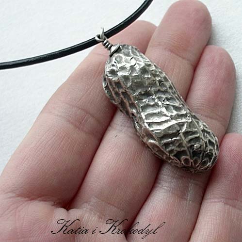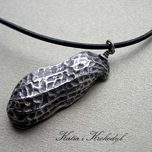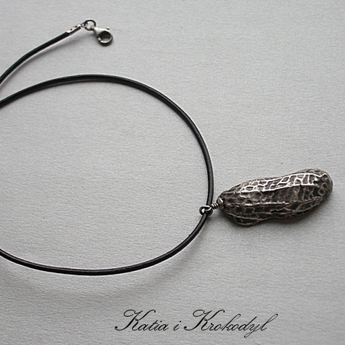 Męski naszyjnik wykonany ze srebra [pr. 925] na lakierowanym rzemieniu w połączeniu z własnoręcznie wykonanym orzeszkiem ziemnym [uzyskanym z odcisku naturalnego orzeszka - kształt i wielkość: 42 mm, srebro pr. 999 , waga 12,5 gr.]. Całość ręcznie oksydowana i polerowana, widoczne w orzeszku zgrubienia i żyłki dodatkowo wypolerowane na wysoki połysk. Całkowita długość naszyjnika 43cm. Biżuteria ozdobnie zapakowana.