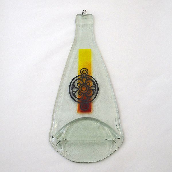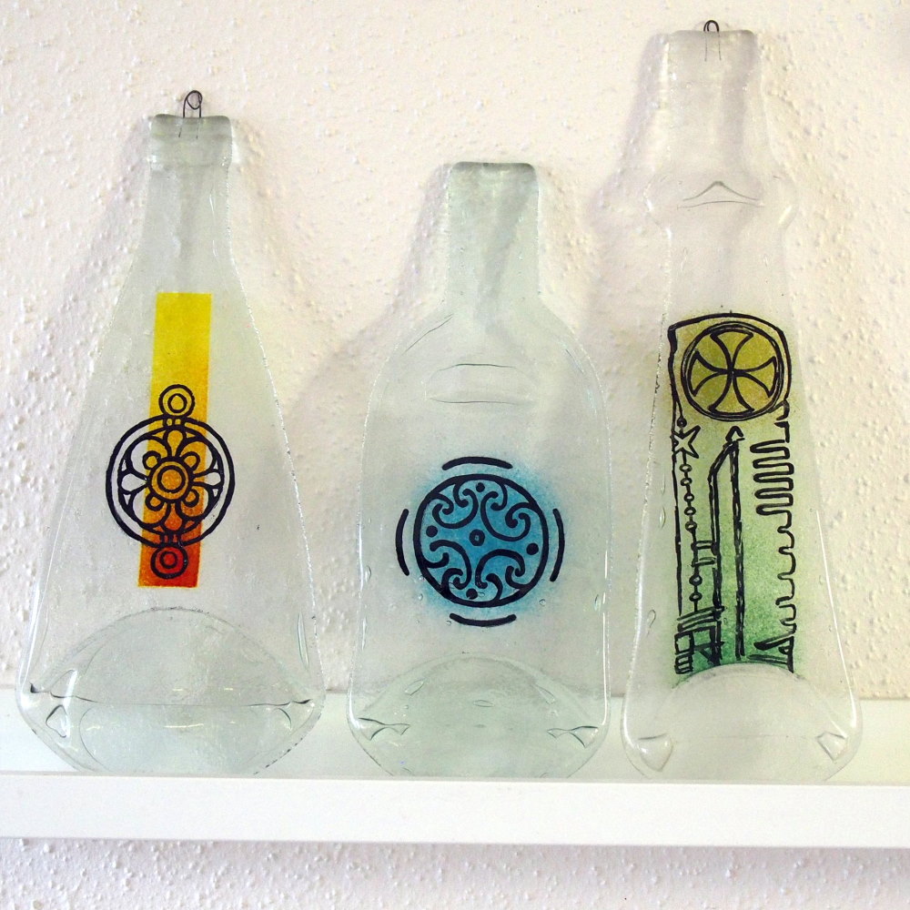 Spłaszczona pod wpływem temperatury i grawitacji butelka z dodatkiem koloru i malowanego misternie średniowiecznego wzoru. Praca trzykrotnie wypalana :). Może być używana w poziomie, ale dzięki drucikowi w szyjce można ją zawiesić jako dekor np. w kuchni, gdzie stworzy ciekawy, średniowieczny klimat.
