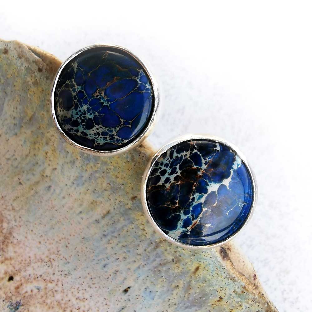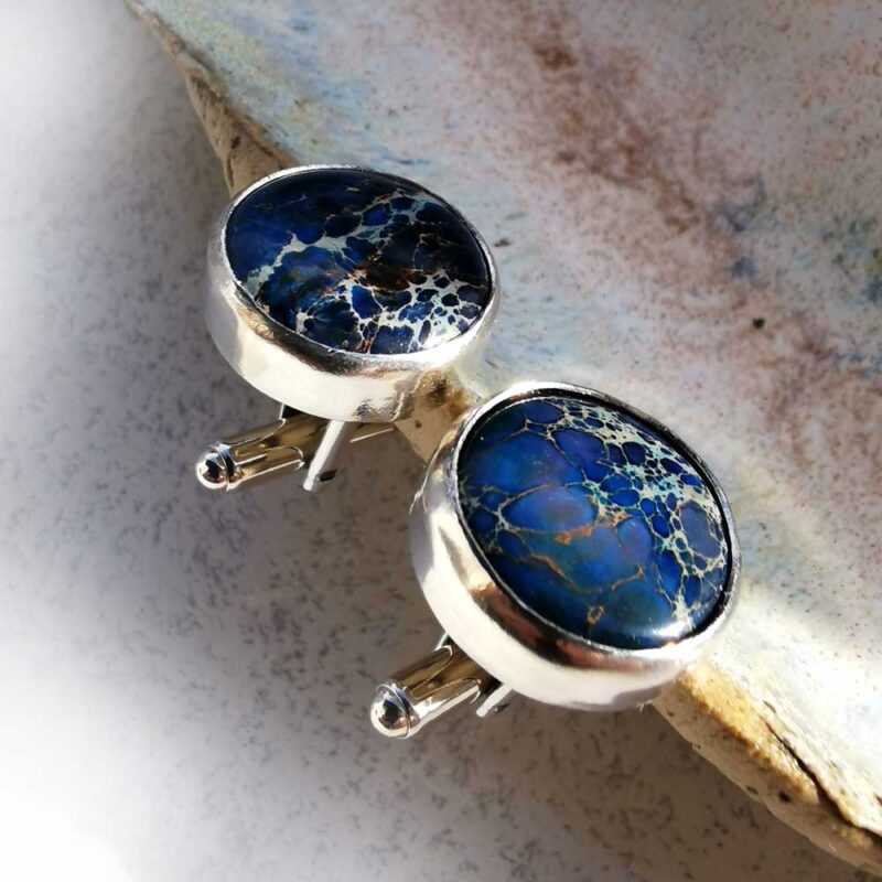 Okrągłe spinki do mankietów wykonane zostały ze srebra próby 925 i granatowych jaspisów cesarskich. Wybarwienie kamieni przywodzi na myśli kosmiczne galaktyki. Srebro w procesie tworzenia było polerowane, a spód oprawy kamienia satynowany i fakturowany. Spinki będą stylowym uzupełnieniem męskiego stroju wieczorowego lub trafionym prezentem dla przyszłego pana młodego. Materiał: srebro próby 925, jaspis cesarski Wielkość kamienia: 18 mm Waga: 13,3 g Spinki zostaną elegancko zapakowane.