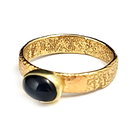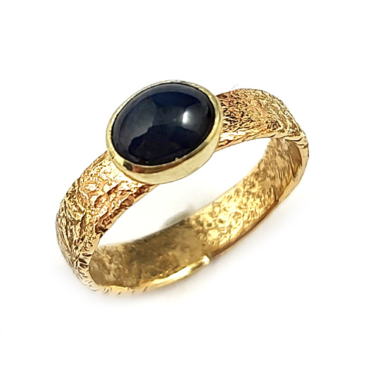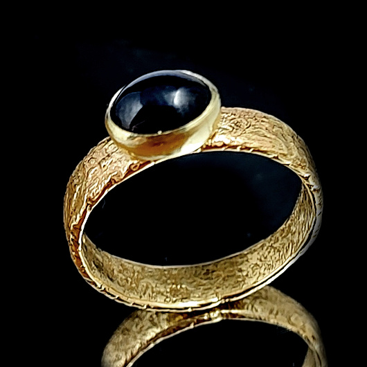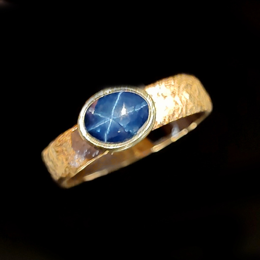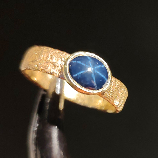Pierścień wykonany od podstaw własnoręcznie ze złota próby 585, 14 K. Rozmiar jubilerski 17, bez możliwości zmiany rozmiaru. Ozdobą pierścionka jest przepikny szafir gwiaździsty ze zjawiskiem asteryzmu- bardzo wyraźna gwiazda, zjawisko widoczne w skupionym świetle (żarówka, halogen, słońce) porusza się wraz ze źródłem światła.Wymiary oprawy kamienia 7 x 9 mm, szerokość obrączki 4 mm. Waga pierścionka 5 gramów. Pierścień zostanie zapakowany w ozdobne pudełeczko