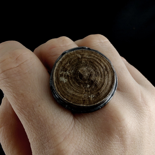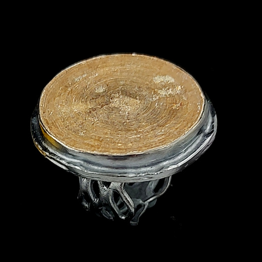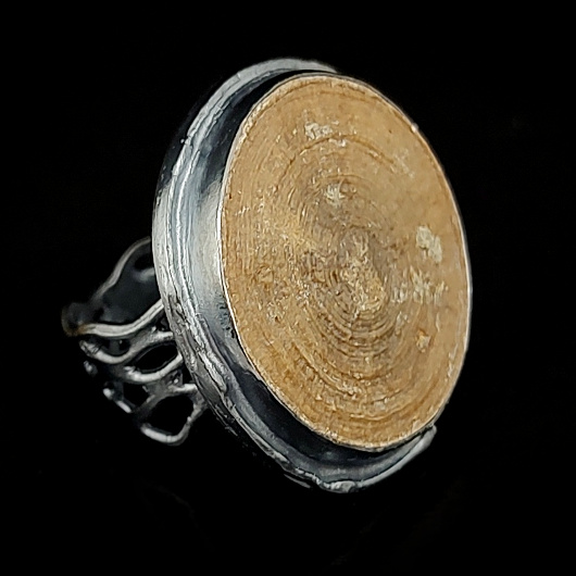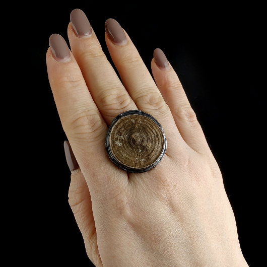 Okazały pierscień z oprawionym własnoręcznie w oksydowane srebro próby 925 skamieniałym koralowcem. Średnica oprawy 30 mm, rozmiar jubilerski 19 do powiększenia na max 21. Waga 15 g. Zapakowany w ozdobne pudełeczko. Polecam z wisiorem i kolczykami z galerii.