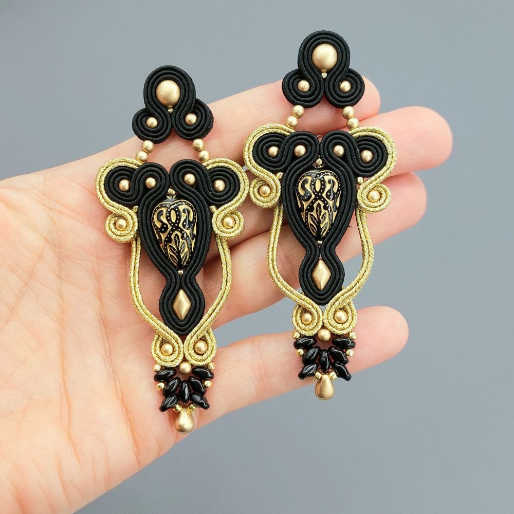 Kolorystyczna klasyka w nieklasycznym wydaniu. Kolczyki z koralikami w stylu vintage, w nietypowej, ażurowej formie. Oryginalne i unikatowe – bardzo ozdobne kolczyki wieczorowe. Elegancki model do koktajlowej sukienki. Elementy użyte w biżuterii: ozdobne koraliki z ornamentem, kaboszony CzechMates, koraliki Toho, koraliki Round Beads, koraliki GemDuo, koraliki SuperDuo, złote małe łezki, czeskie i greckie sznurki sutasz, sztyfty ze stali chirurgicznej. Tył biżuterii wykończony welurem lub alcantarą w kolorze dobranym do biżuterii. Długość kolczyków: 9cm. Waga kolczyków: 5g. Kolory: czarny, złoty. Biżuteria jest zaimpregnowana i zapakowana w pudełeczko. Istnieje możliwość wykonania tego wzoru w innej kolorystyce – szczegóły do uzgodnienia w kontakcie prywatnym. Wykonuję również biżuterię na zamówienia indywidualne.