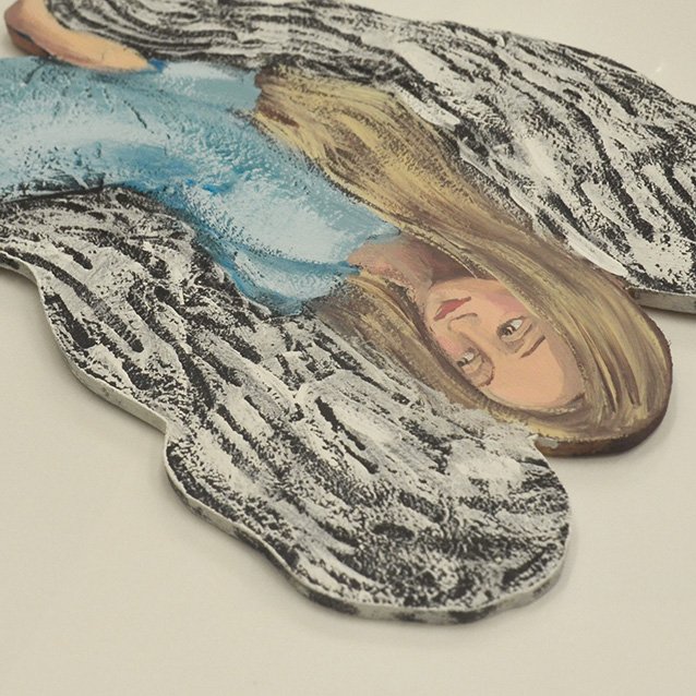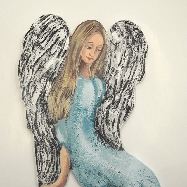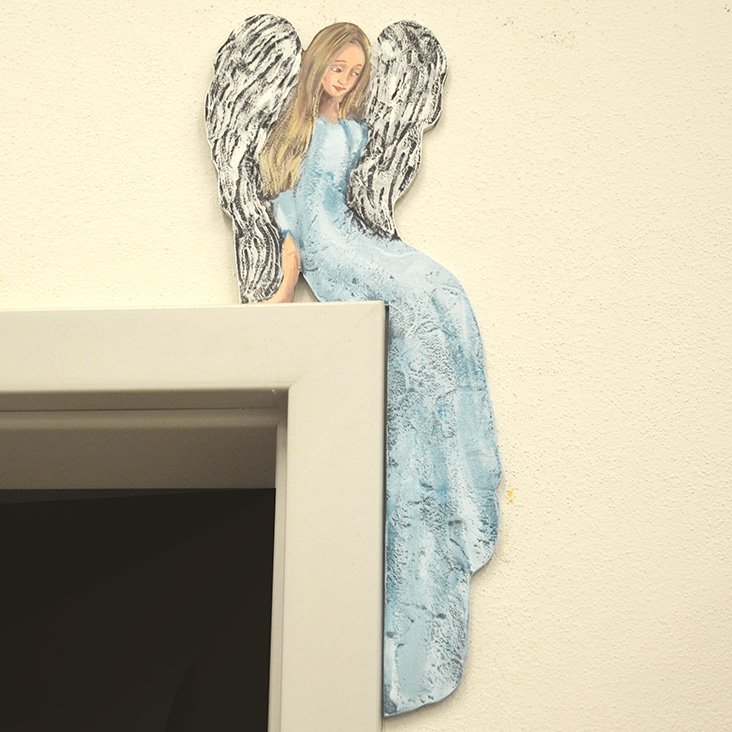 Anioł ręcznie malowany na drewnianej, dociętej do kształtu płycie. Wymiar ok. 50 cm x 19 cm x 5 mm. Można go umieścić na futrynie bądź ramie lustra czy półce z kantem. Widoczna faktura na skrzydłach i szacie. Doskonały prezent na dla bliskiej osoby.