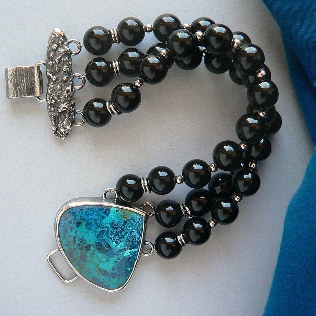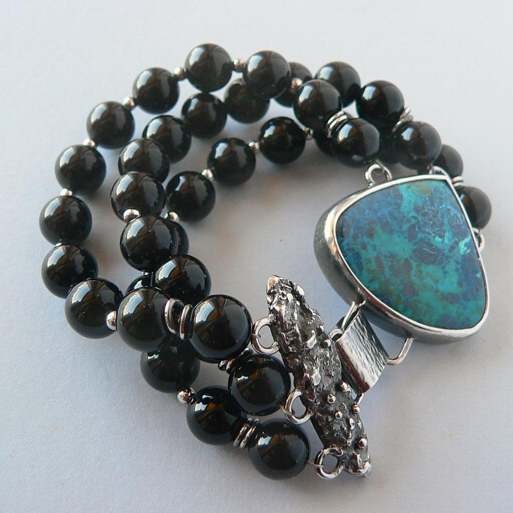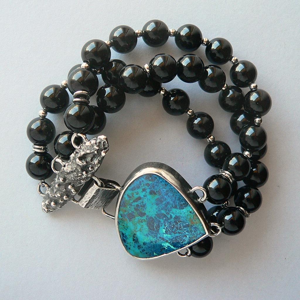 Masywna bransoleta wykonana ze srebra, rzadkiego, pięknego kolorystycznie minerału o nazwie szatukit i onyksów. Srebro fakturowane, formowane ogniem, oksydowane, detale polerowane. Wymiary kamienia 3,7/3,3 cm, kule onyksu- 1 cm Bransoletka pasuje na nadgarstek o obwodzie 16,5-17 cm wygodne w samodzielnej obsłudze zapięcie.