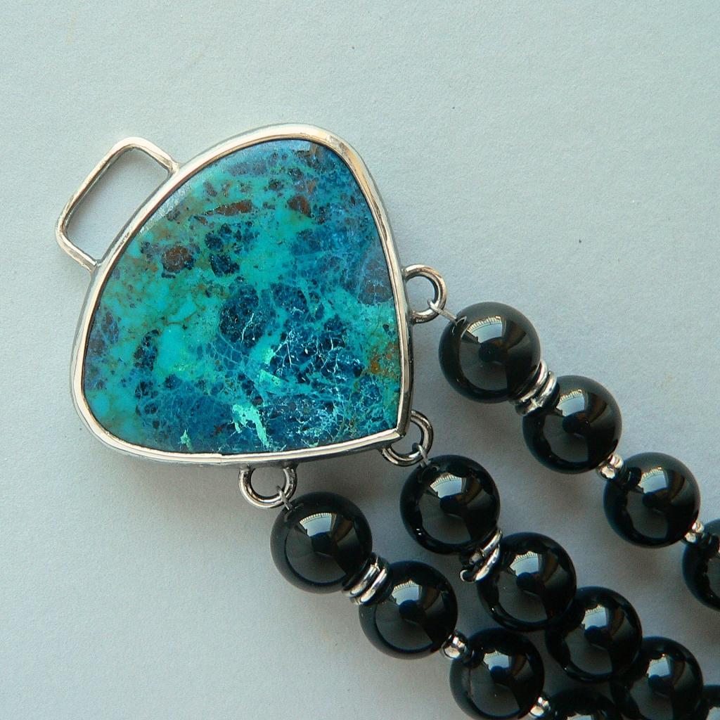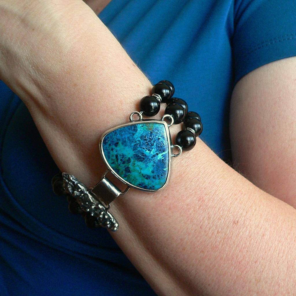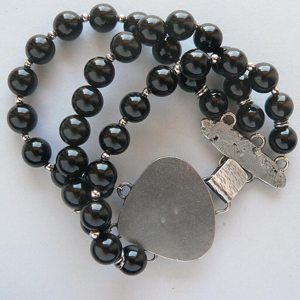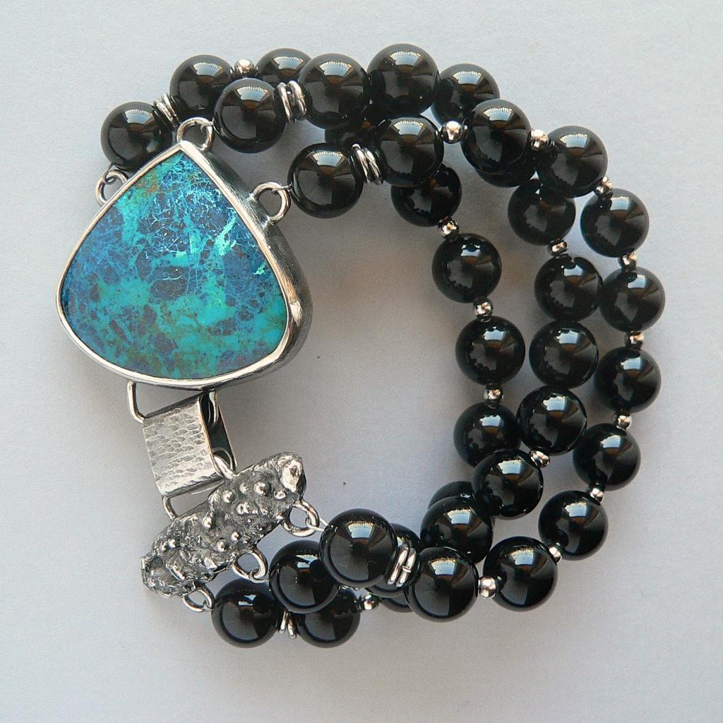 Masywna bransoleta wykonana ze srebra, rzadkiego, pięknego kolorystycznie minerału o nazwie szatukit i onyksów. Srebro fakturowane, formowane ogniem, oksydowane, detale polerowane. Wymiary kamienia 3,7/3,3 cm, kule onyksu- 1 cm Bransoletka pasuje na nadgarstek o obwodzie 16,5-17 cm wygodne w samodzielnej obsłudze zapięcie.