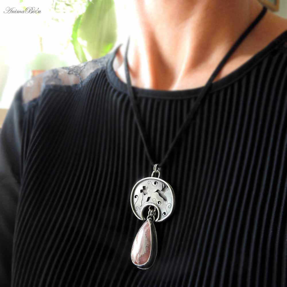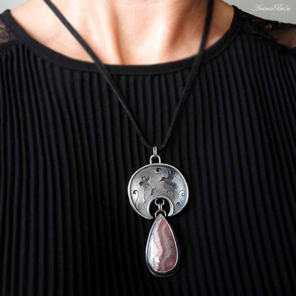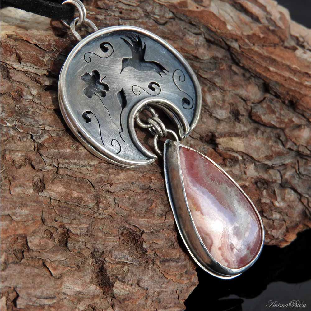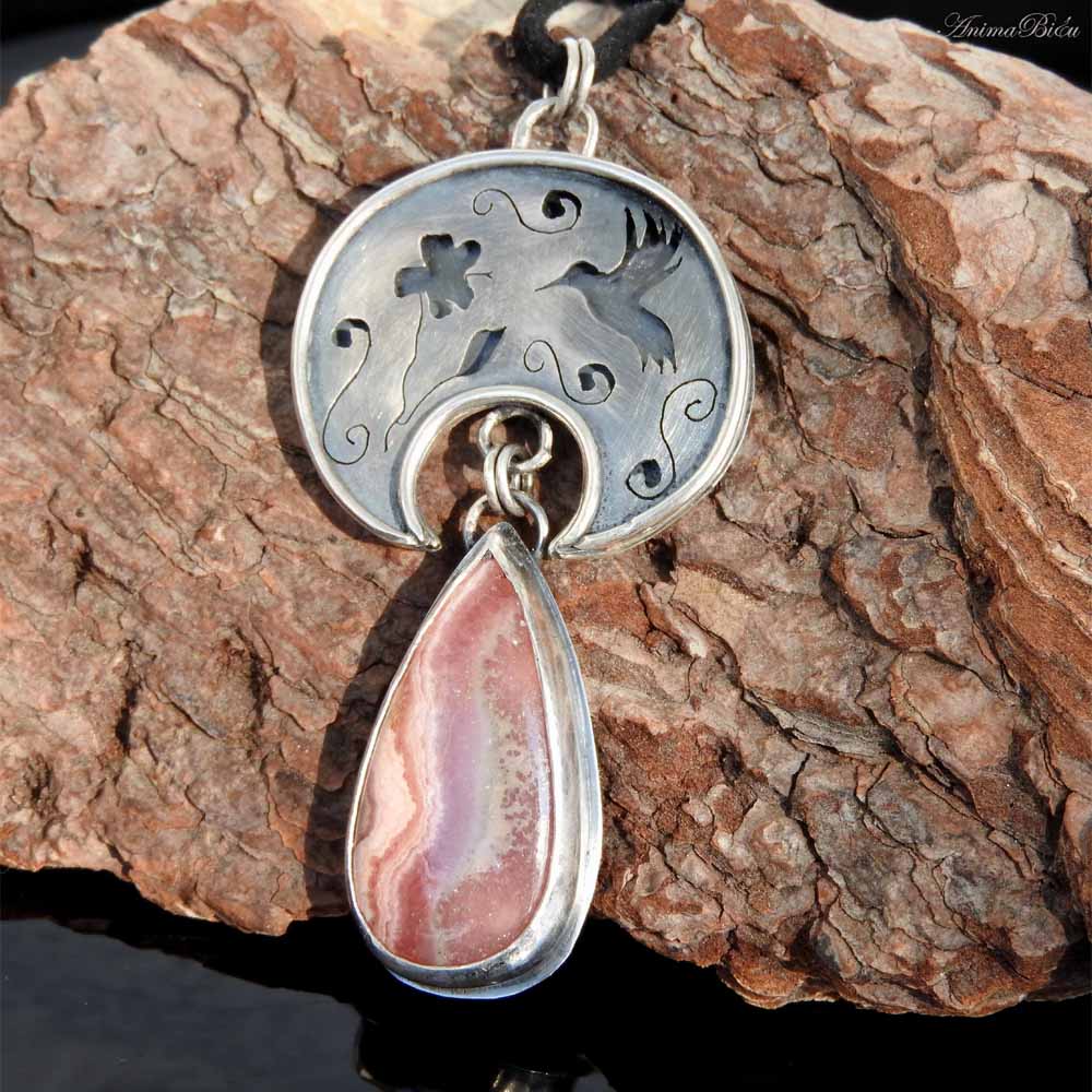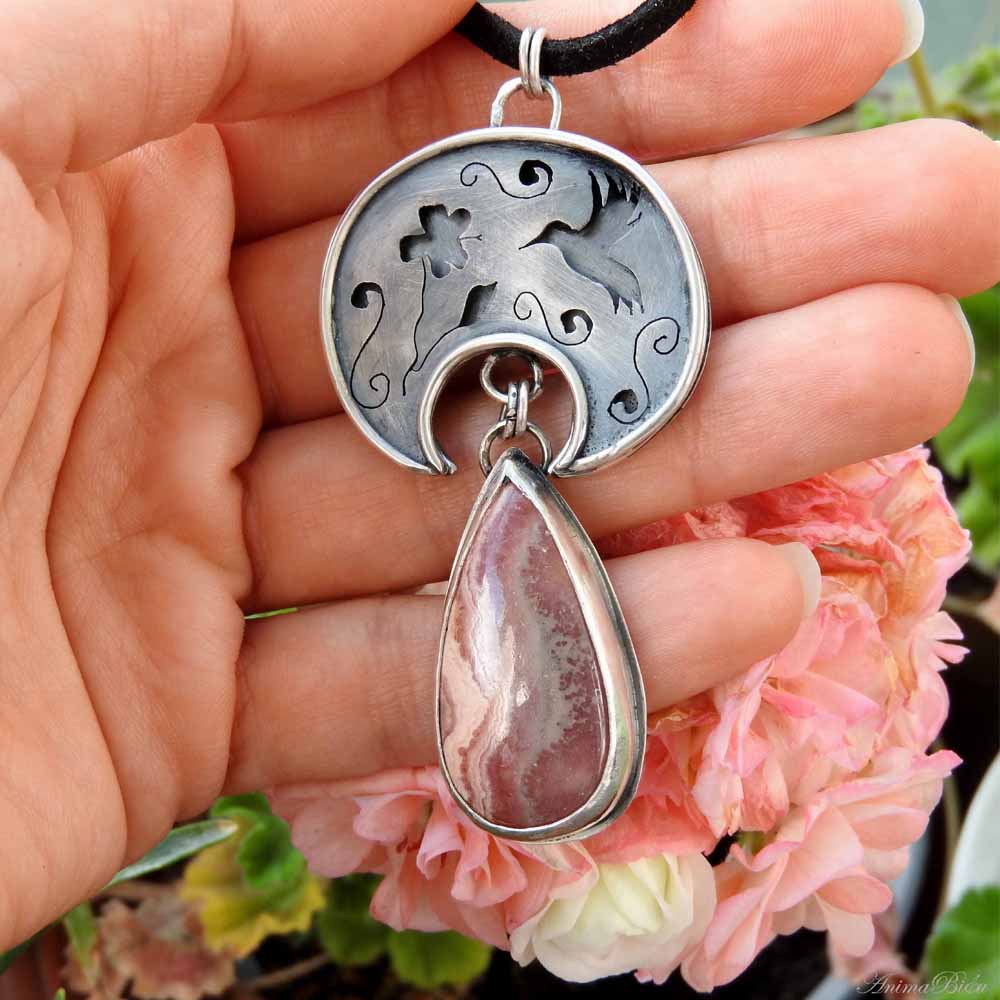 Wisiorek srebrny lunula z rodochrozytem. Wisiorek został w całości wykonany ręcznie ze srebra próby 925 i 999. Góra wisiorka jest w kształcie półksiężyca – lunuli. Jest to słowiańska ozdoba będąca symbolem kobiecości i płodności. Został w niej wycięty kształt kolibra podlatującego do hibiskusa. Dla podkreślenia trójwymiarowości zdobień srebro przyciemniłam i przetarłam. Dół wisiorka stanowi urocza kropla różowo popielatego rodochrozytu. Całość wykonałam techniką lutowania i młotkowania. Długość całego wisiorka to 7 cm. Szerokość lunuli wynosi 3,4 cm. Waga 18,4 g, w tym srebro 12,2 g. Cechowany w Urzędzie Probierczym. Wisiorek zawiesiłam na czarnym, zamszowym rzemyczku długości 48 cm ze srebrnym zapięciem (próba925).