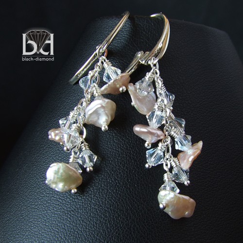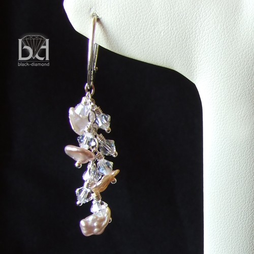 Urokliwe kolczyki wykonane z pereł keishi, kryształów Swarovski z poświatą moonlight oraz srebra. Bigle angielskie zamykane - stabilne i bezpieczne. Długość całkowita wynosi 5 cm, bez bigli 4,3 cm. Biżuterię otrzymasz wraz z pudełkiem jubilerskim.